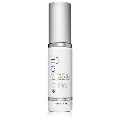 KERACELL® CBD Soothing Daily Facial Moisturizer is a THC FREE formula designed with Certified Organic Hemp Seed Oil and CBD Isolate which work synergistically with stem cell based growth factors activating cell vitality and reducing inflammation, whereby soothing skin. Restores suppleness and protects skin against daily environmental stress while promoting microbiata balance. Stabilized Vitamin C addresses discolorations and Pro-Vitamin B5 and Vitamin E reduce transepidermal water loss.