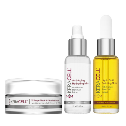 This is an amazing opportunity to sample 3 of the most popular KERACELL® products at an incredible value. The KERACELL® Anti-Aging Hydrating Mist, the Liquid Gold Enriching Elixir and the V-Shape Neck & Décolleté Cream.